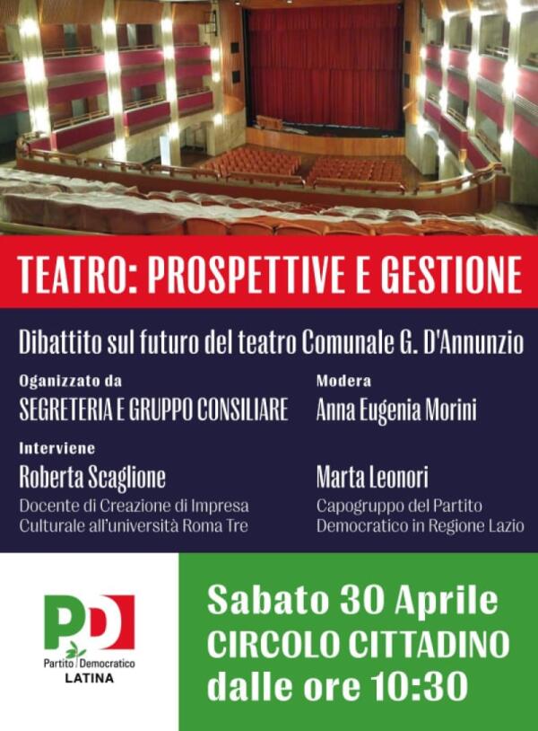 Il Pd di Latina propone per questo sabato l’incontro “Teatro: prospettive e gestione”, per parlare del “D’Annunzio” in vista della sua riapertura.