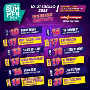 Dal 10 al 21 luglio, si torna a ballare e a cantare sotto le stelle con la terza edizione del Chiesuola Summer Fest, rassegna musicale tra le più attese dell’estate pontina. Un appuntamento ormai consolidato, che torna a proporre dodici serate consecutive di musica dal vivo, rigorosamente a ingresso gratuito.