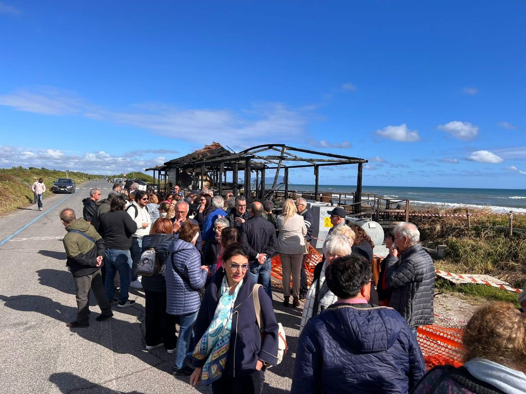 Chioschi in fiamme sul lungomare Latina: flash mob di solidarietà ieri al Lido, all’altezza del primo chiosco, per dimostrare vicinanza ai concessionari del primo e quinto chiosco, andati completament...