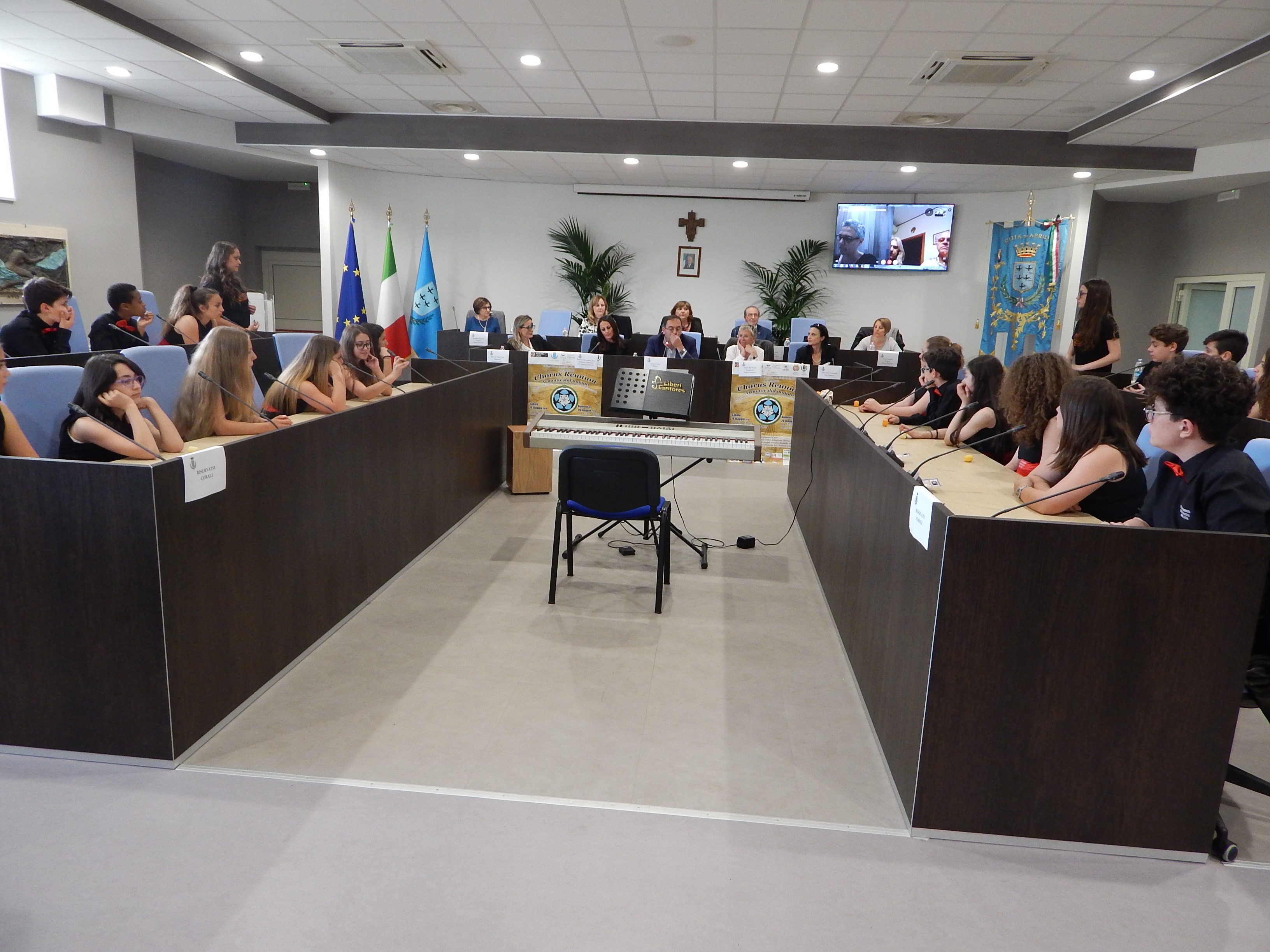 Suggestivi i brani eseguiti per l'occasione dal Coro di Voci Bianche dell'I.C. Pascoli e la telefonata via Skype, sia con la città di Barcellona, sia con Carpi, rappresentate dai presidenti delle associazioni corali, affinché la partecipazione, seppur in lontananza, fosse collettiva e … corale, con la partecipazione del presidente dei Liberi Cantores, Maria Pia Fenzi, il referente del progetto Katia Sartori e il referente interculturale Laura Zardi.