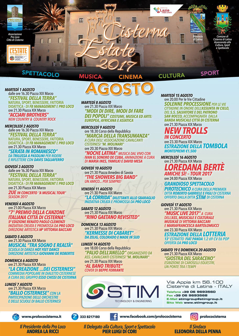 “Si rinnova il nostro impegno – spiega il presidente della Pro Loco Cisterna, Andrea La Ricci – per creare un programma di tutto rispetto con artisti di livello nazionale ma anche con il forte apporto di realtà culturali ed artistiche locali di ottima qualità. Ringrazio l’Amministrazione comunale per la collaborazione e tutti i nostri sponsor che, nonostante il momento economico particolare, non hanno fatto mancare il loro sostegno economico a questa importante manifestazione cittadina”.
