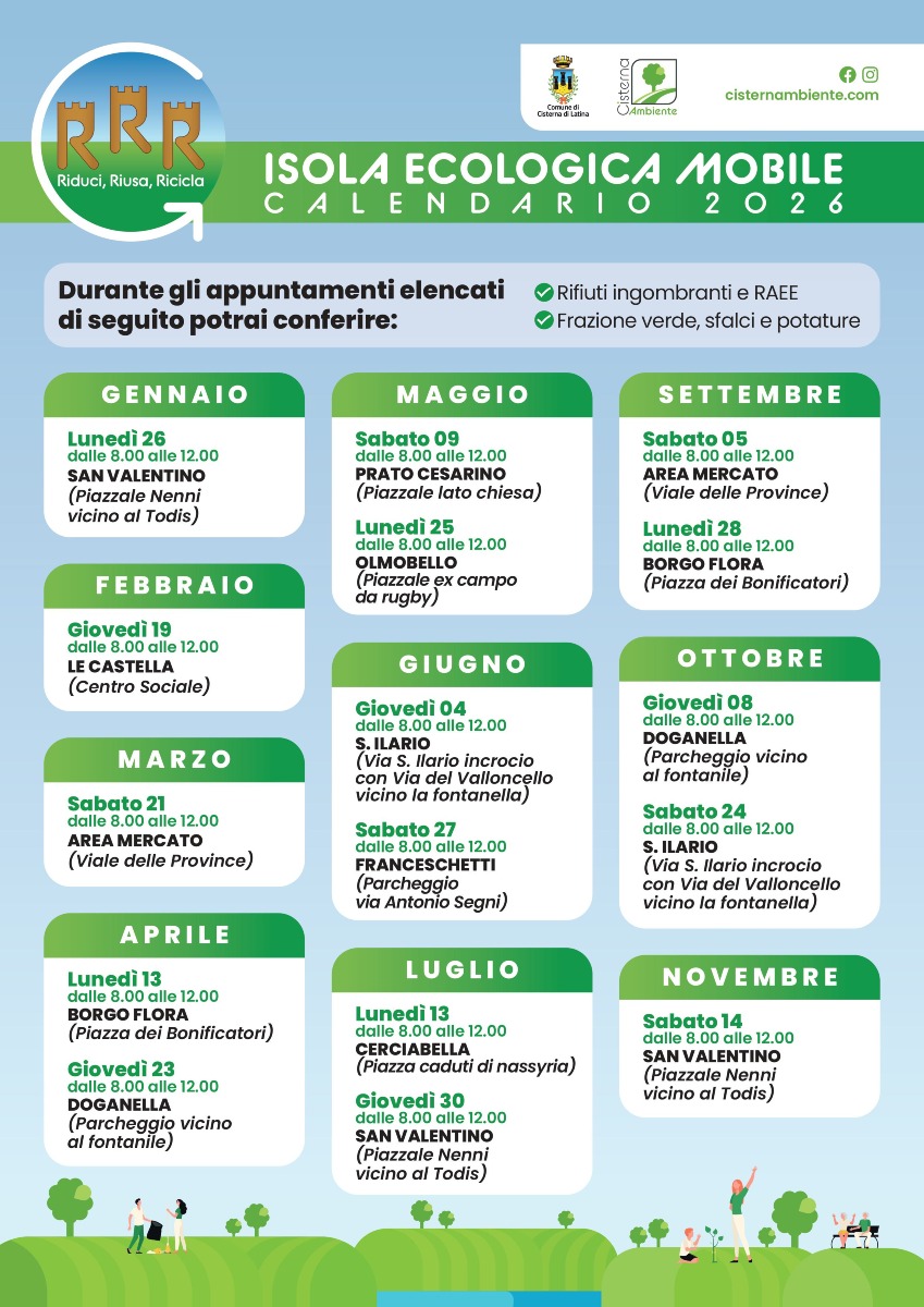 A Cisterna riprende dalla prossima settimana il servizio di raccolta di rifiuti ingombranti, di apparecchiature elettriche ed elettroniche, di sfalci e potature organizzato dalla Cisterna Ambiente attraverso le isole ecologiche mobili. E’ stato predisposto il calendario per tutto il 2026, esteso ed ampliato a numerose aree del territorio. Si parte lunedì 26 gennaio: l’isola ecologica sosterà nel quartiere di San Valentino, in piazzale Nenni vicino al Todis, dalle 8.00 alle 12.00.