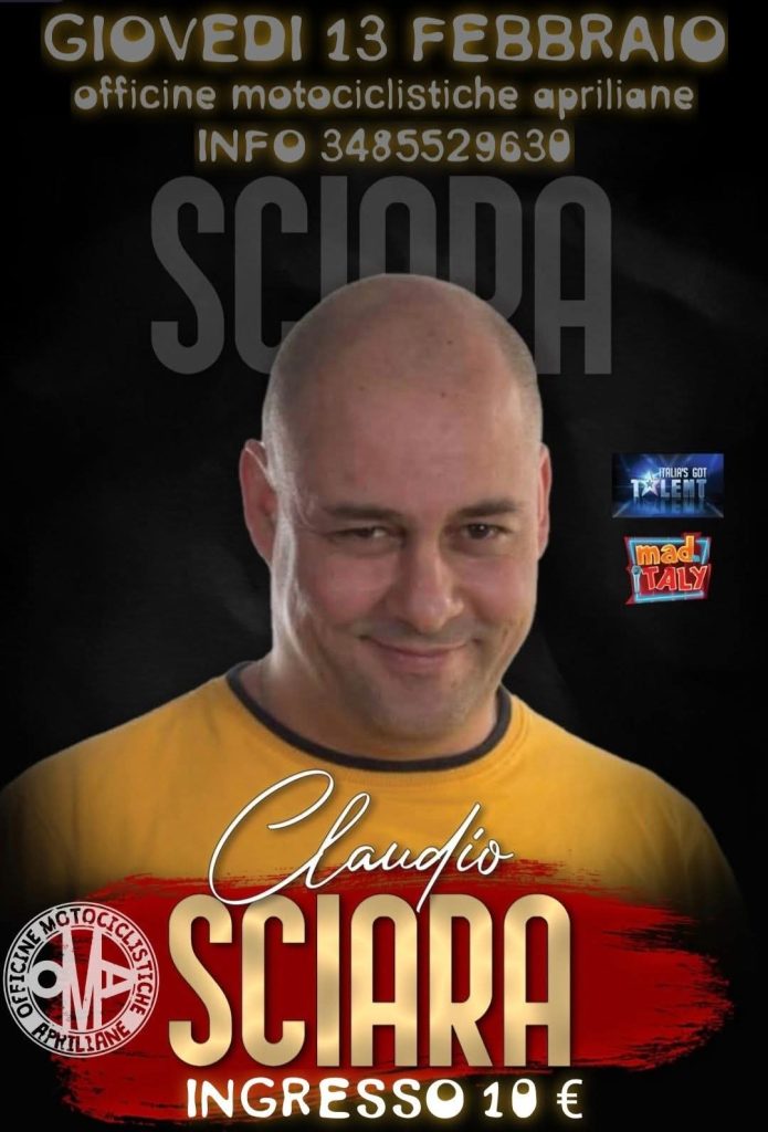 “Comedy Show” con Claudio Sciara e Geppo alle Officine Motociclistiche Apriliane, il noto locale che si trova sulla via Nettunense, ad Aprilia, all’angolo con via Giovanni XXIII. Il primo appuntamento è per giovedì 13 Febbraio alle 21.30 con il comico Claudio Sciara. Giovedì 13 Marzo, sempre alle 21.30, sarà poi la volta di Simone Metalli, in arte Geppo Show.