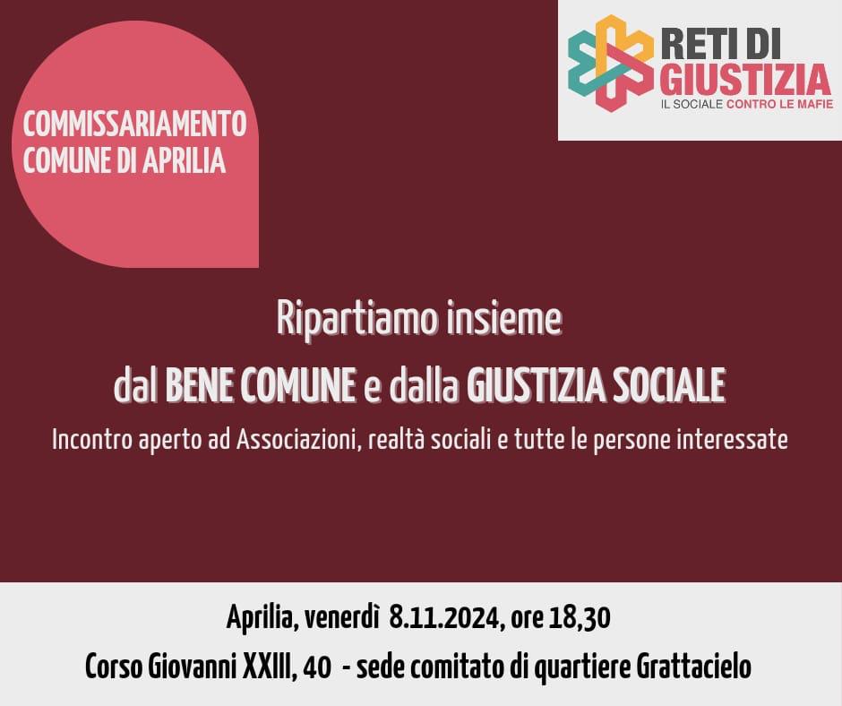 Commissione d’accesso ad Aprilia, Reti di Giustizia-Il Sociale contro le mafie fissa un incontro su cui riflettere su quanto sta affrontando la comunità. Venerdì 8 novembre alle 18.30 presso la sede d...