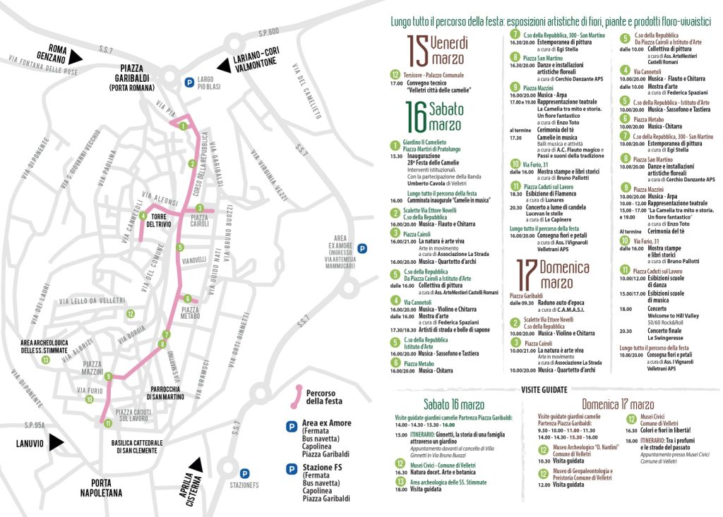 L’Amministrazione Comunale ha predisposto parcheggi nell’area ex Amore (lungo Via Appia /Via dei Volsci) con navetta gratuita verso il centro storico, così da evitare code e file nel tratto urbano. Non resta che immergersi nelle atmosfere magiche della 28esima Festa delle Camelie, una due giorni in cui Velletri riscopre il proprio fiore simbolo e si mostra a cittadini e turisti nella sua storica e millenaria bellezza.