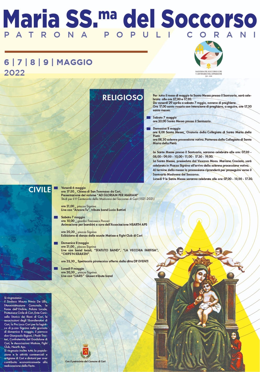 «I 500 anni dall’apparizione della Vergine a Cori rappresentano un appuntamento storico – dice il sindaco di Cori Mauro De Lillis – e quella di quest’anno sarà una festa del tutto eccezionale. D’altro canto non poteva essere altrimenti, perché la “Madonna”, come la chiamiamo familiarmente noi coresi, rappresenta per noi un “dato” della nostra vita non solo dal punto di vista religioso, ma anche personale e sociale. Il fatto poi di arrivare dopo due pesanti anni di pandemia e di chiudere il V centenario della Madonna del Soccorso renderà conferirà ad ogni momento sia religioso sia civile un carico di emozioni ancora più forti».