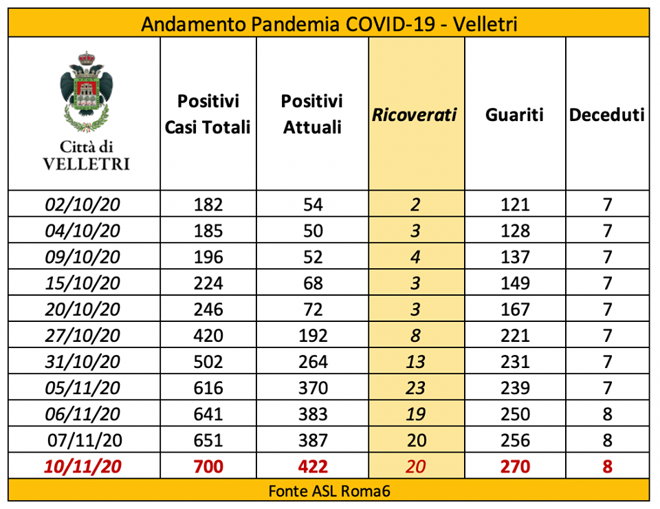 Coronavirus a Velletri. Situazione sempre più difficile. Lo conferma il sindaco Pocci. “Aggiornamento tabella e grafico sull'andamento della pandemia a Velletri, - spiega il sindaco - abbiamo raggiunto i 700 casi totali dall'inizio della pandemia e si registra un costante aumento dei positivi mentre appare stabile il numero delle persone ricoverate. Questa mattina partecipo all'assemblea dei sindaci della Asl Roma 6 per comprendere meglio la situazione del territorio. Come annunciato ieri, il pronto soccorso dell'ospedale di Velletri è stato riaperto dopo le operazioni di sanificazione”.