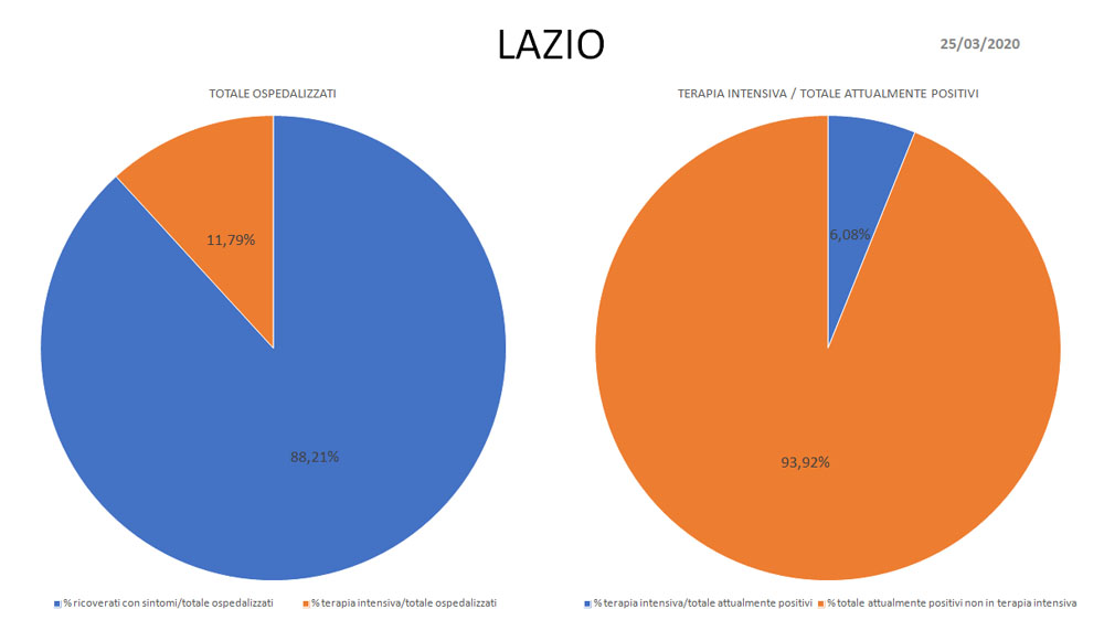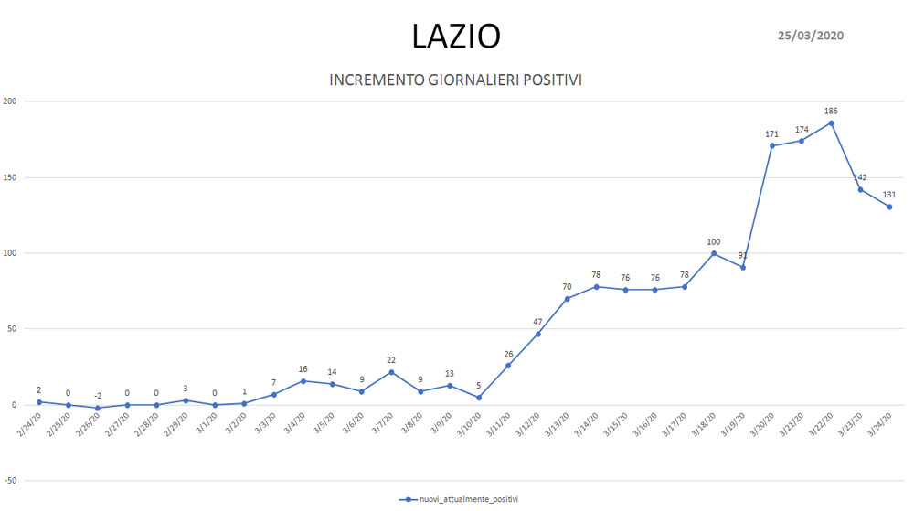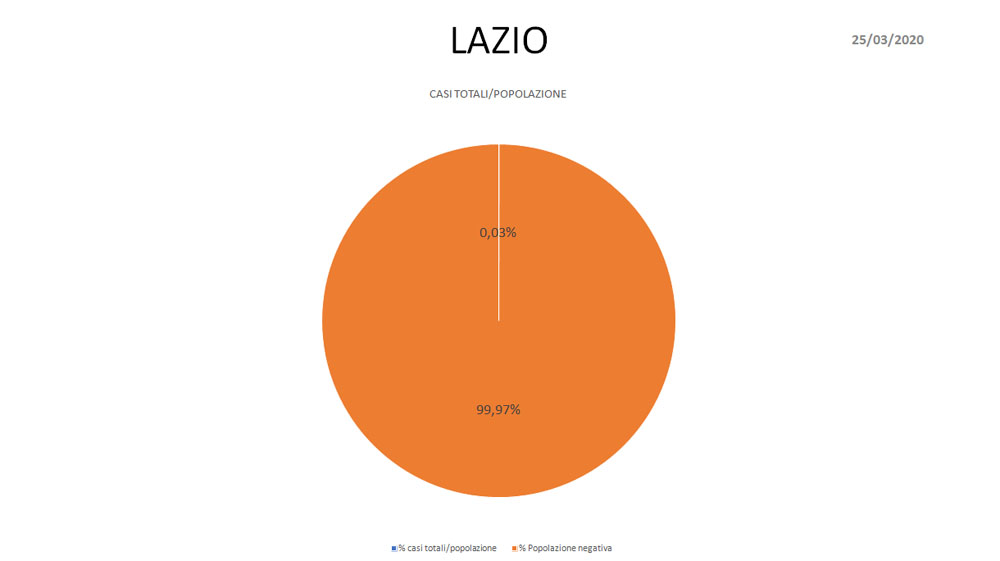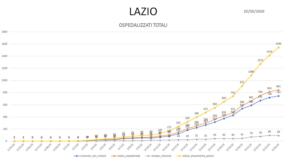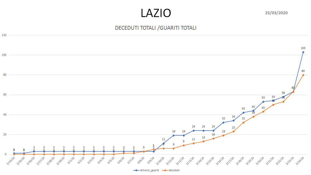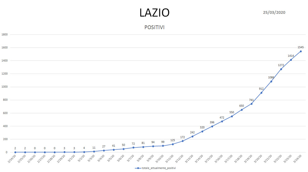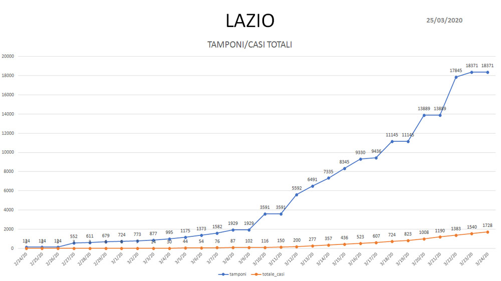 Coronavirus: tutti i dati aggiornati con l’andamento dei contagi nel Lazio. Ecco le rappresentazioni grafiche, realizzate per noi dal Dottor Matteo Mezzi, sulla base dei dati ufficiali - aggiornati al 24 marzo - della Presidenza del Consiglio dei Ministri-Dipartimento della Protezione Civile.