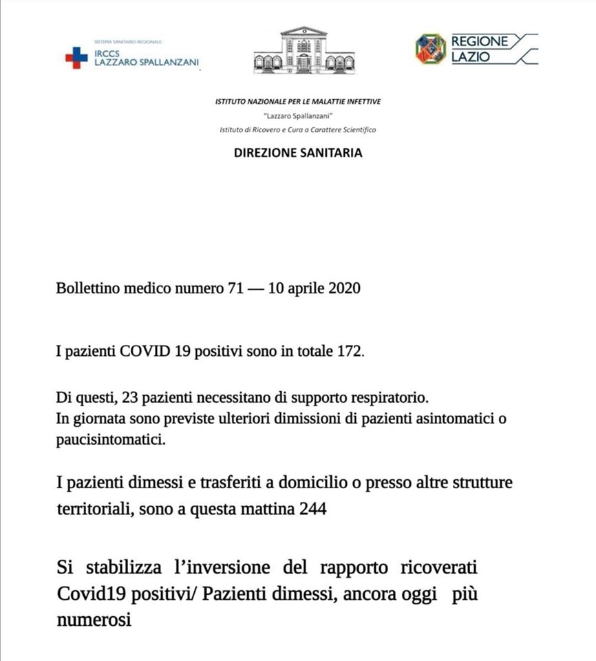 Coronavirus, ecco il bollettino medico di oggi, venerdì 10 aprile, dell’INMI Spallanzani: 172 pazienti positivi. Sempre più numerosi i dimessi. Di seguito i dettagli: