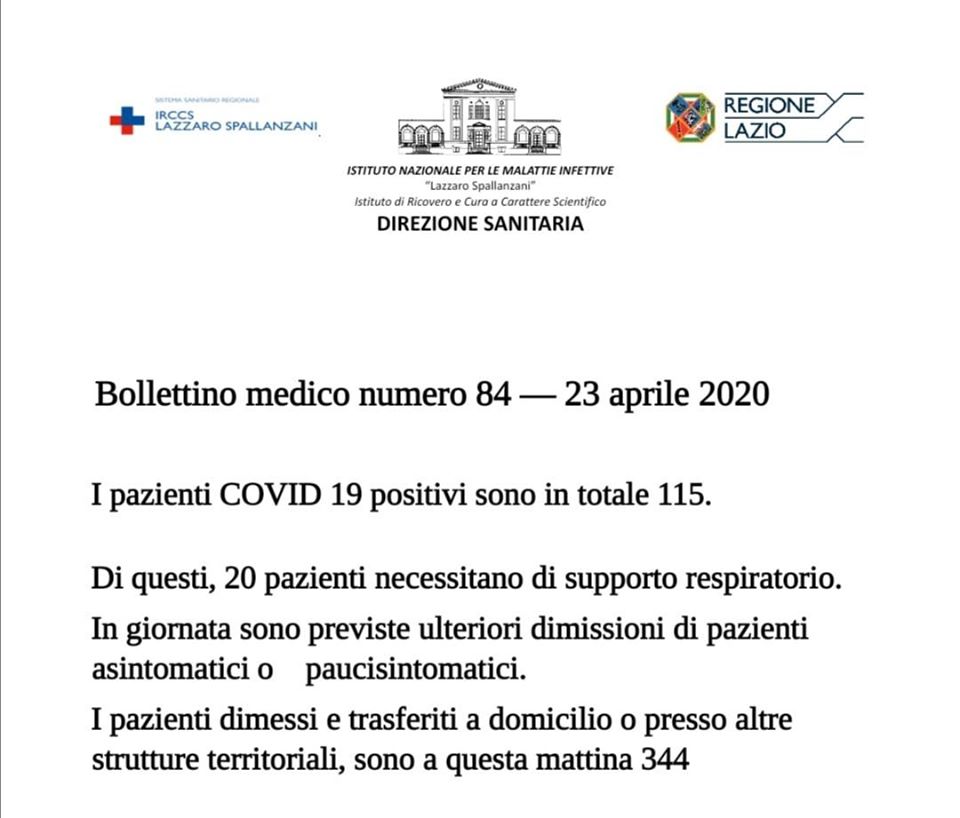L'INMI Spallanzani di Roma ha diramato il bollettino medico n. 84 di oggi, giovedì 23 aprile: “i positivi Covid-19 ricoverati oggi scendono a 115”. Ecco tutti i dettagli: