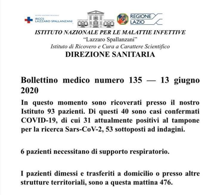 Coronavirus, il bollettino medico dello Spallanzani di Roma: 93 ricoverati, 40 sono casi positivi confermati.