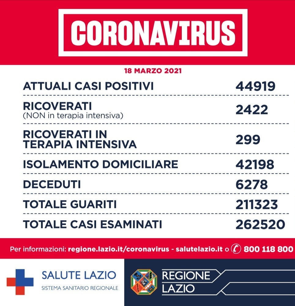 Nella Asl Roma 1 sono 340 i casi nelle ultime 24h e si tratta di casi isolati a domicilio o con link familiare o contatto di un caso già noto. Sono diciannove i ricoveri. Si registrano cinque decessi con patologie. Nella Asl Roma 2 sono 361 i casi nelle ultime 24h e si tratta di casi isolati a domicilio o con link familiare o contatto di un caso già noto. Sono centododici i casi su segnalazione del medico di medicina generale. Si registrano sei decessi con patologie. Nella Asl Roma 3 sono 104 i casi nelle ultime 24h e si tratta di casi isolati a domicilio o con link familiare o contatto di un caso già noto. Si registra un decesso con patologie. Nella Asl Roma 4 sono 181 i casi nelle ultime 24h e si tratta di casi isolati a domicilio o con link familiare o contatto di un caso già noto. Si registra un decesso con patologie. Nella Asl Roma 5 sono 205 i casi nelle ultime 24h e si tratta di casi isolati a domicilio o con link familiare o contatto di un caso già noto. Nella Asl Roma 6 sono 193 i casi nelle ultime 24h e si tratta di casi isolati a domicilio o con link familiare o contatto di un caso già noto. Si registrano due decessi con patologie. Nelle province si registrano 579 casi e sono otto i decessi nelle ultime 24h. Nella Asl di Latina sono 225 i nuovi casi e si tratta di casi isolati a domicilio o con link familiare o contatto di un caso già noto. Nella Asl di Frosinone si registrano 234 nuovi casi e si tratta di casi isolati a domicilio, contatti di un caso già noto o con link familiare. Si registrano sei decessi di 77, 80, 81, 87, 92 e 93 anni con patologie. Nella Asl di Viterbo si registrano 60 nuovi casi e si tratta di casi isolati a domicilio o con link familiare o contatto di un caso già noto. Si registra un decesso di 95 anni con patologie. Nella Asl di Rieti si registrano 60 nuovi casi e si tratta di casi isolati a domicilio o con link familiare o contatto di un caso già noto. Si registra un decesso di 92 anni con patologie