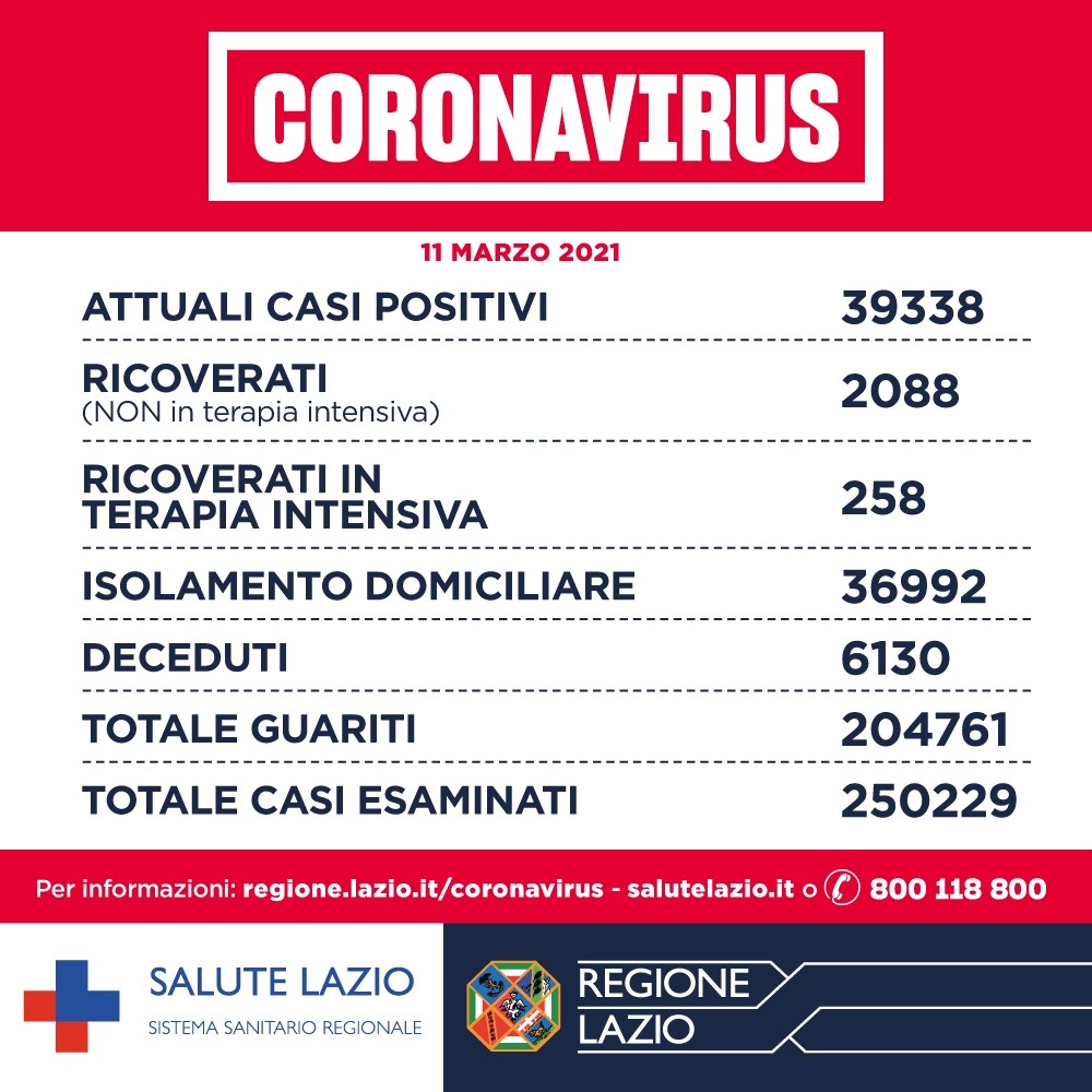 Nella Asl Roma 1 sono 432 i casi nelle ultime 24h e si tratta di casi isolati a domicilio o con link familiare o contatto di un caso già noto. Diciannove casi sono ricoveri. Si registrano tre decessi con patologie. Nella Asl Roma 2 sono 307 i casi nelle ultime 24h e si tratta di casi isolati a domicilio o con link familiare o contatto di un caso già noto. Sono novantasette i casi su segnalazione del medico di medicina generale. Si registra un decesso con patologie. Nella Asl Roma 3 sono 102 i casi nelle ultime 24h e si tratta di casi isolati a domicilio o con link familiare o contatto di un caso già noto. Un caso è un ricovero. Si registrano tre decessi con patologie. Nella Asl Roma 4 sono 134 i casi nelle ultime 24h e si tratta di casi isolati a domicilio o con link familiare o contatto di un caso già noto. Si registrano due decessi con patologie. Nella Asl Roma 5 sono 131 i casi nelle ultime 24h e si tratta di casi isolati a domicilio o con link familiare o contatto di un caso già noto. Si registra un decesso con patologie. Nella Asl Roma 6 sono 188 i casi nelle ultime 24h e si tratta di casi isolati a domicilio o con link familiare o contatto di un caso già noto. Si registra un decesso con patologie. Nelle province si registrano 506 casi e sono cinque i decessi nelle ultime 24h. Nella Asl di Latina sono 150 i nuovi casi e si tratta di casi isolati a domicilio o con link familiare o contatto di un caso già noto. Si registrano due decessi di 85 e 87 anni con patologie. Nella Asl di Frosinone si registrano 253 nuovi casi e si tratta di casi isolati a domicilio, contatti di un caso già noto o con link familiare. Si registrano due decessi di 74 e 88 anni con patologie. Nella Asl di Viterbo si registrano 28 nuovi casi e si tratta di casi isolati a domicilio o con link familiare o contatto di un caso già noto. Nella Asl di Rieti si registrano 75 nuovi casi e si tratta di casi isolati a domicilio o con link familiare o contatto di un caso già noto. Si registra un decesso di 74 anni con patologie
