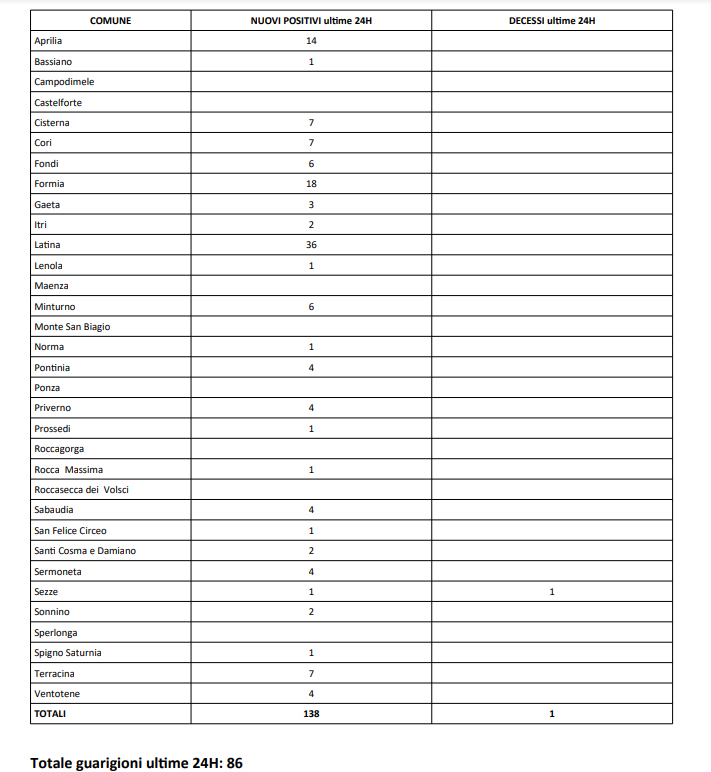 Coronavirus – I dati di oggi forniti dalla Asl di Latina riferiscono di 138 nuovi casi e un decesso nel Comune di Sezze. I guariti in 24 ore sono 86. Oggi sono stati registrati 14 casi ad Aprilia, 7 a Cisterna, 18 a Formia, 36 a Latina, 7 a Terracina, 4 a Sabaudia e 4 a Ventotene.
