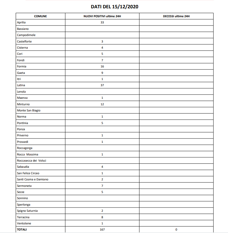 Coronavirus – Sono 167 oggi i nuovi casi in provincia di Latina. Lo rende noto la Asl nel consueto bollettino. Oggi non si registrano nuovi decessi, ma non ci sono neanche nuovi guariti.Ieri giornata...