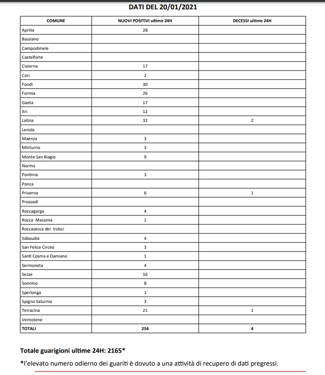 Nella Asl di Latina oggi sono stati registrati 254 casi positivi e 4 decessi avvenuti nei comuni di Latina (2), Terracina e Priverno. Tra i nuovi casi 28 sono ad Aprilia, 17 a Cisterna, 30 a Fondi, 26 a Formia, altri 17 casi sono emersi a Gaeta, 32 a latina, 16 a Sezze e 21 a Terracina. Oggi numero elevatissimo di guariti che sfonda la quota dei 2 mila: “Un numero alto – spiega la Asl – che raccoglie le notifiche pregresse delle ultime settimane”.