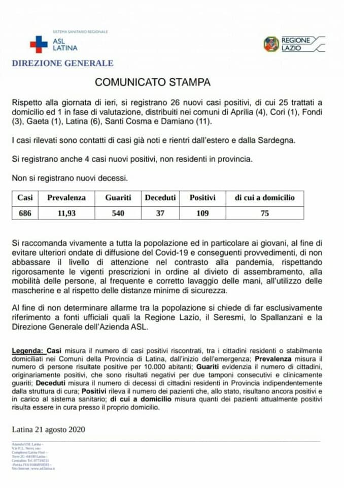Coronavirus – Il bollettino di oggi della Asl di Latina è più pesante del solito: rispetto ieri, infatti, si registrano 26 nuovi casi positivi in tutta la provincia, 25 sono trattati a domicilio ed 1 è in fase di valutazione. I casi sono stati registrati ad Aprilia (4 positivi), 3 positivi a Fondi, sei a Latina, 11 a Santi Cosma e Damiano, uno rispettivamente a Cori e Gaeta. Pesano anche nella nostra provincia i rientri dall’estero e dalla Sardegna. Sono stati registarti anche 4 casi nuovi positivi, non residenti in provincia. Mentre per fortuna continuano a non esserci nuovi decessi.