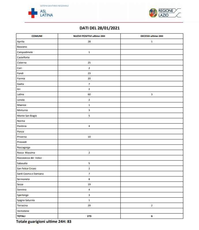 Coronavirus, nella Asl di Latina 273 positivi e 6 decessi: 1 ad Aprilia, 3 a Latina, 2 a Terracina