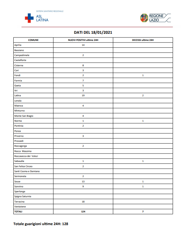 Coronavirus. Nella asl di Latina oggi 124 casi e 7 decessi avvenuti nei comuni di Fondi, Sezze, Sabaudia, Sonnino, due a Latina, e uno a Norma. 128 le persone guarite.I dati comune per Comune