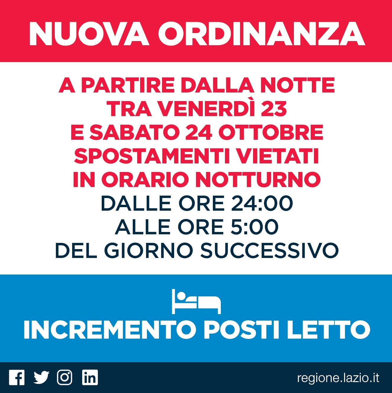 - A partire dalla notte tra venerdì 23 ottobre e sabato 24 ottobre, vietare gli spostamenti in orario notturno sul territorio della Regione, dalle ore 24:00 alle ore 5:00 del giorno successivo, salvo che per gli spostamenti motivati da comprovate esigenze (a titolo esemplificativo, per i lavoratori, il tragitto domicilio, dimora e residenza verso il luogo di lavoro e viceversa), e per gli spostamenti motivati da situazioni di necessità o d’urgenza, ovvero per motivi di salute.
