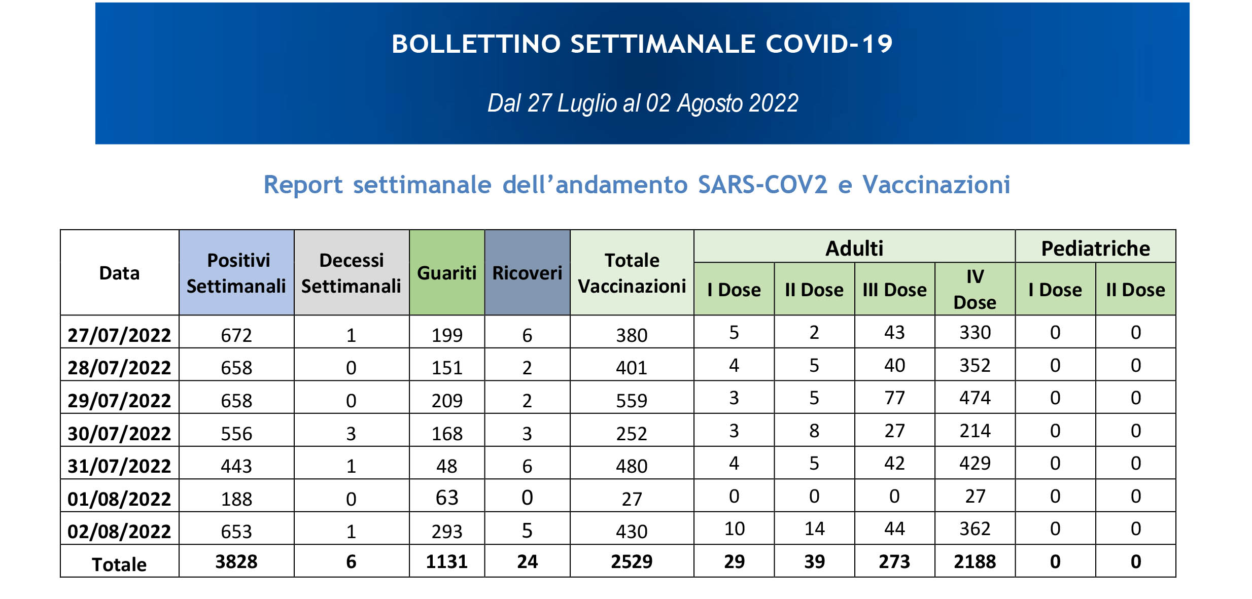 Per quanto riguarda l'andamento settimanale, dal 27 luglio al 2 agosto si sono registrati 3828 nuovi positivi e 6 decessi, mentre 24 sono stati complessivamente i ricoveri.