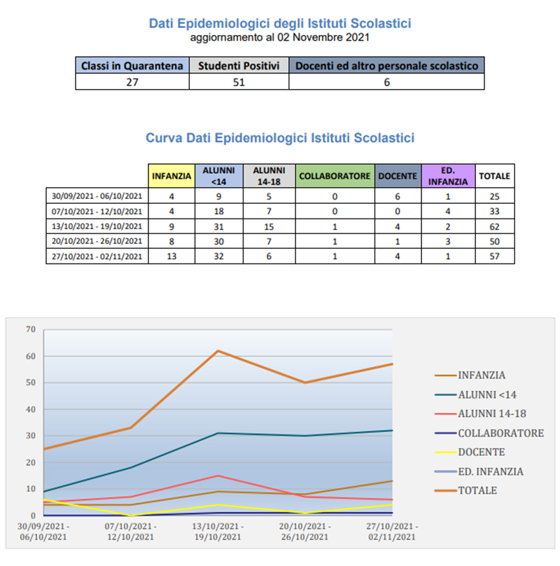 Nelle scuole del territorio, attualmente, ci sono 27 classi in quarantena, per la positività al Covid di 51 studenti e 6 tra personale scolastico e docenti.