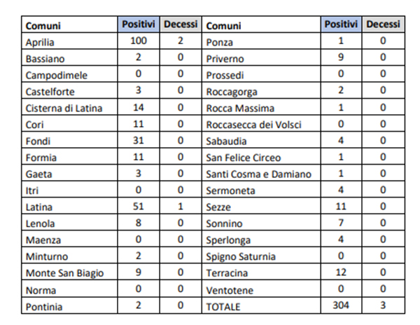 Nell’ultima settimana in provincia di Latina ci sono stati 304 nuovi casi di positività al Covid, 3 decessi e 137 guarigioni. La città con il maggior numero di contagi, come detto, è Aprilia con 100 casi e due decessi. Seguono Latina (con 51 casi ed un decesso) e Fondi con 31 contagi.