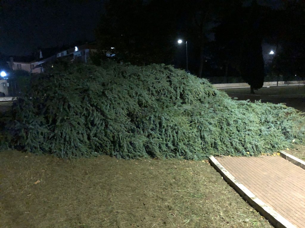 Crollo di alberi e rami pericolanti ieri per il forte vento: un albero, ad Aprilia, si abbatte sul prato del parco via Gramsci.