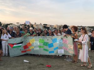Il messaggio che si è levato dalla spiaggia di Anzio è chiaro: sostegno alla Global Sumud Flotilla e stop al genocidio a Gaza compiuto dal governo israeliano con la complicità dei governi compreso quello italiano.