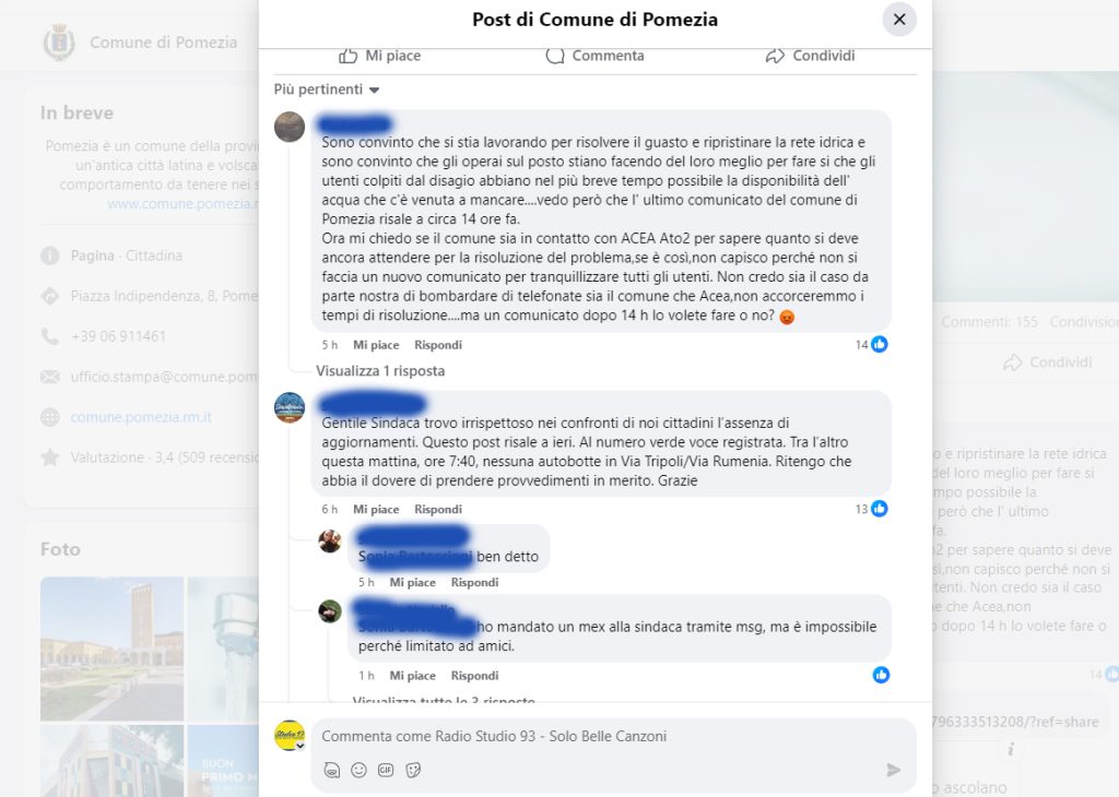Cittadini furiosi e amministrazione assente. Sono più di 24 ore che a Pomezia, in particolare nella zona di Torvaianca, manca l’acqua. Un guasto improvviso ha indotto la società Acea Ato 2 da ieri - lunedì 6 maggio - ad interrompere il servizio idrico per permettere l’esecuzione degli interventi. E’ accaduto ieri nel primo pomeriggio, ma l’acqua non è ancora tornata. Ora dopo ora hanno fatto slittare la riattivazione del servizio, ora l’ultimo annuncio pare riferisca che l’acqua tornerà solo stasera alle 20. E se tutto va bene. Nel frattempo l’amministrazione Comunale di Pomezia non ha fornito alcuna comunicazione tempestiva ai cittadini. In tantissimi infatti hanno lasciato commenti molto duri sulla pagina Facebook dell’ente. L’ultima comunicazione risale a 20 ore fa.