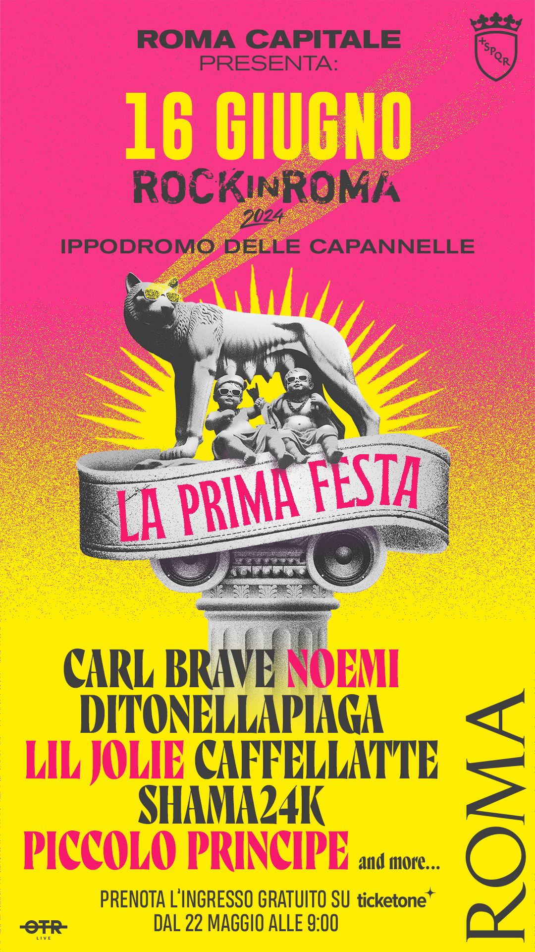 Sarà possibile partecipare gratuitamente prenotandosi sul sito di www.ticketone.it. Direttore artistico e headliner della serata sarà il produttore romano Carl Brave, che chiuderà l’evento con un suo live. Un concerto unico con un programma ricco di artiste e artisti tra i quali, Noemi, Ditonellapiaga, Lil Jolie, Caffellatte, Shama24k e Piccolo Principe e molti altri che saranno confermati nei prossimi giorni.