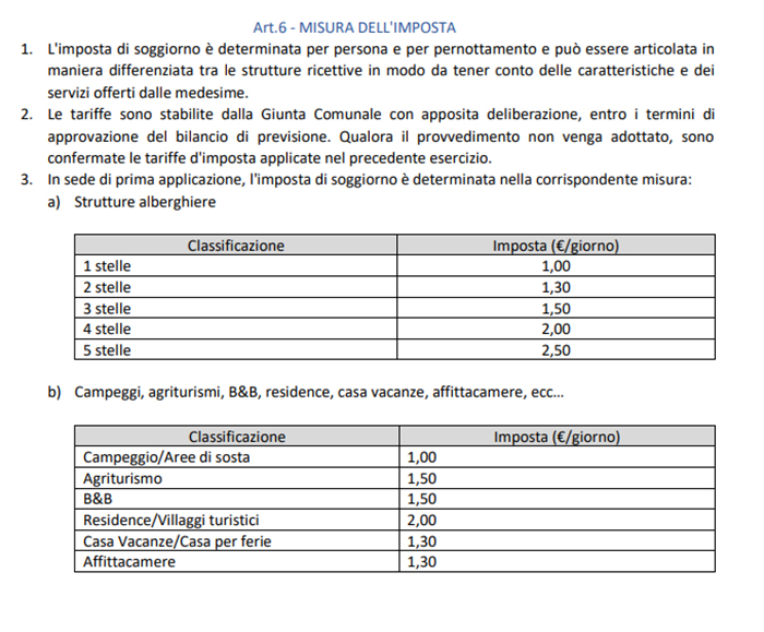 “Considerato che il D. Lgs. 14 marzo 2011, n. 23 “Disposizioni in materia di federalismo Fiscale Municipale”, all’art. 4 - si legge nella delibera - prevede la possibilità per i comuni capoluogo di provincia, le unioni di comuni nonché i comuni inclusi negli elenchi regionali delle località turistiche o città d'arte di istituire, con deliberazione del consiglio, un'imposta di soggiorno a carico di coloro che alloggiano nelle strutture ricettive situate sul proprio territorio, da applicare, secondo criteri di gradualità in proporzione al prezzo, sino a 5 euro per notte di soggiorno.