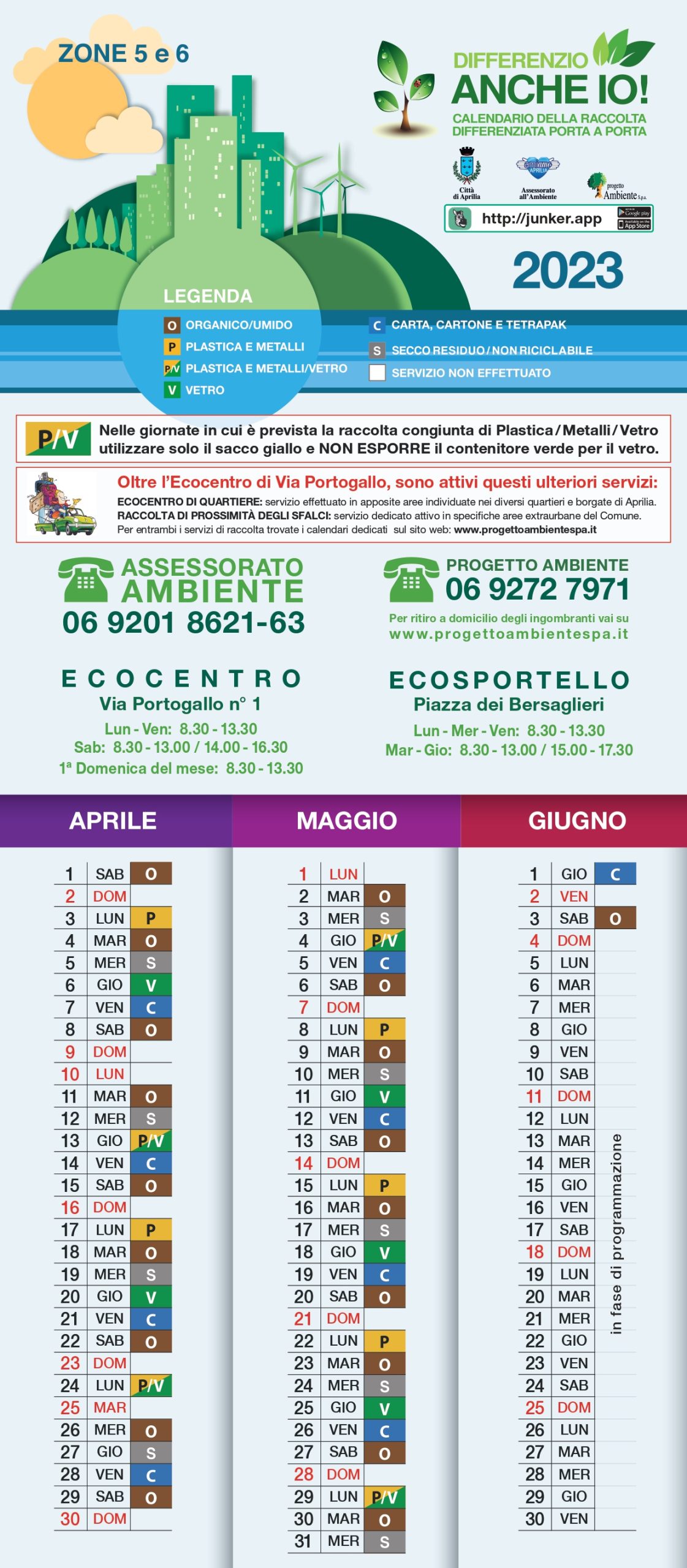 Differenziata ad Aprilia: il Comune e la Progetto Ambiente hanno reso noti i calendari della raccolta domiciliare dei rifiuti per i mesi di Aprile e Maggio 2023. Prossimamente verranno resi noti anche i calendari per il periodo estivo.