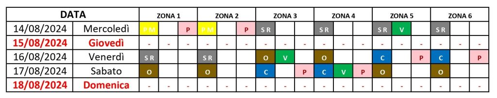 Di seguito l’estratto del calendario di Raccolta Domiciliare dal 14 agosto al 17 Agosto con le relative modifiche: