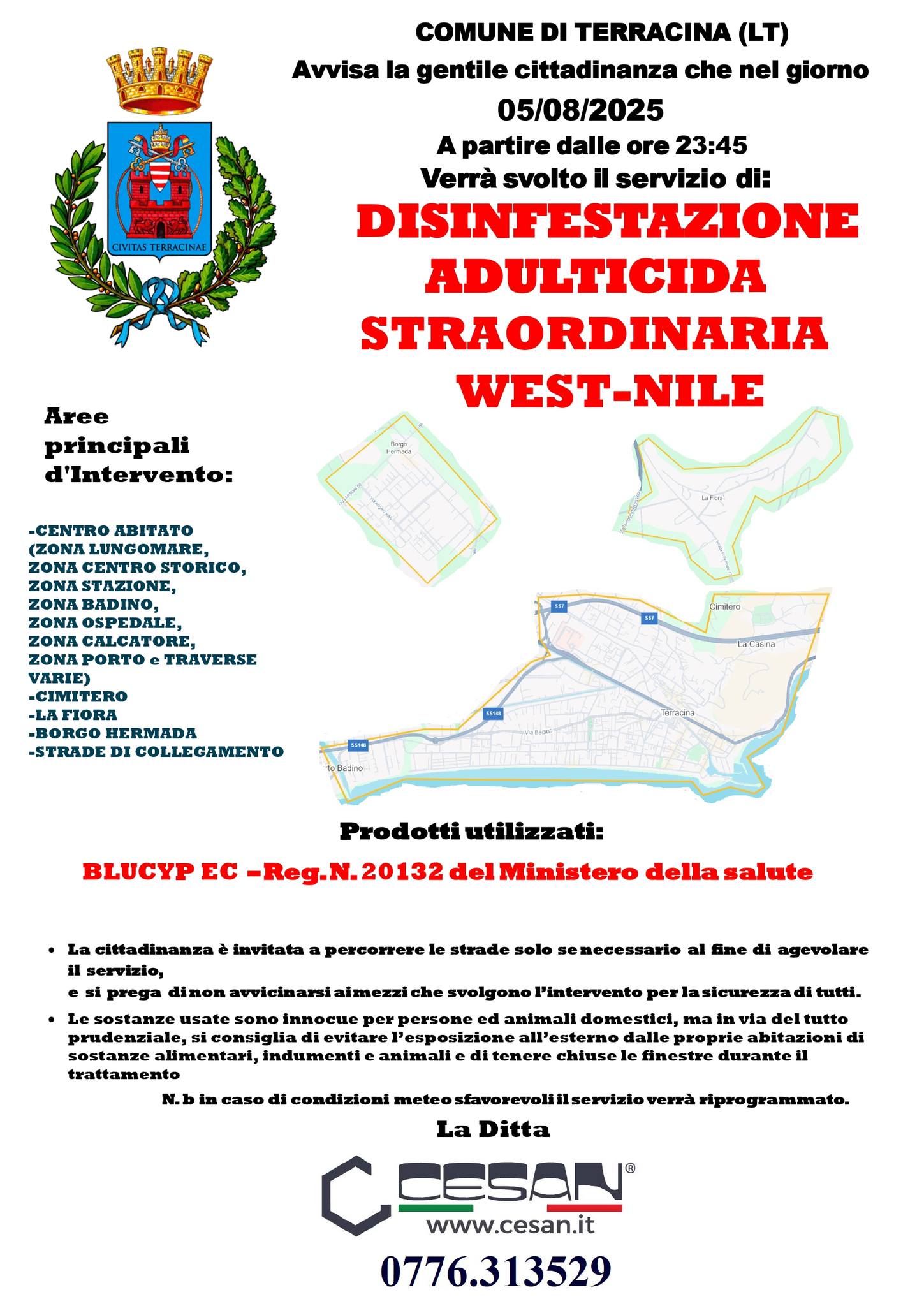 Disinfestazione adulticida straordinaria stasera a Terracina. A partire dalle 23.45 l’intervento verrà eseguito in tutta la zona del centro urbano e del centro storico, sul lungomare, nella zona della stazione, dell’ospedale e in molte altre vie. L’elenco completo è sul nostro sito.