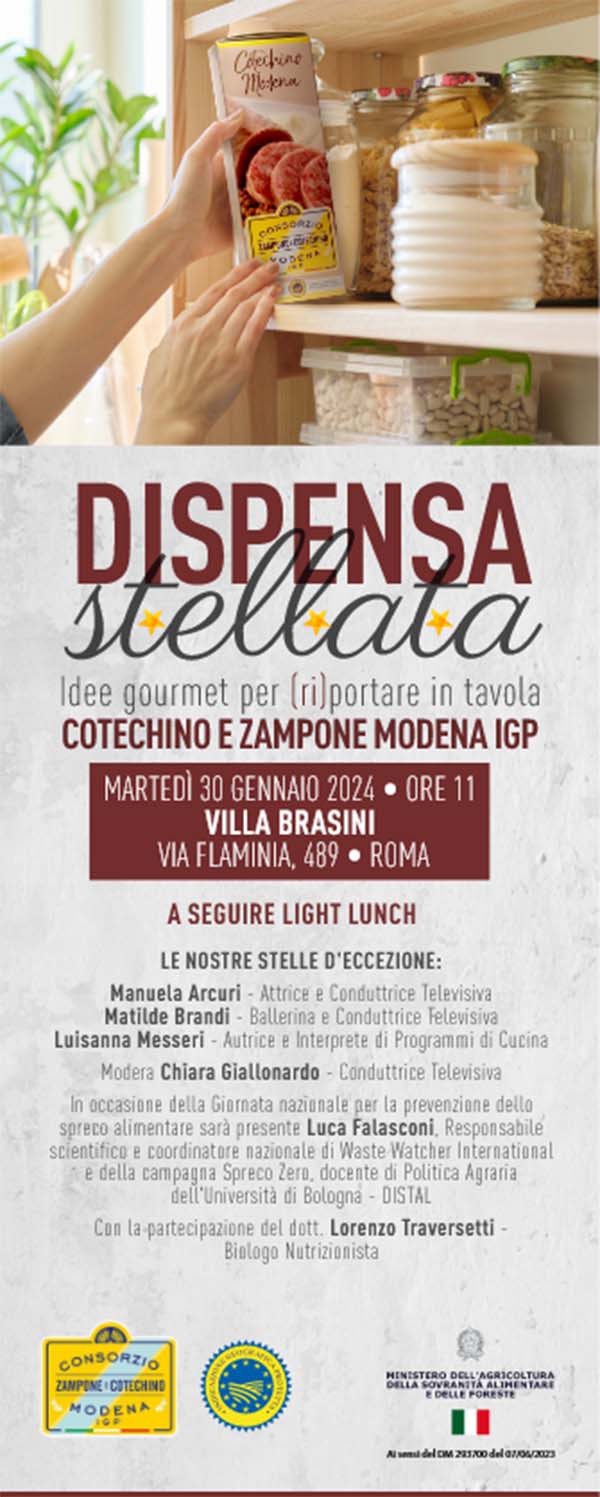 “Dispensa stellata”: a Roma, a Villa Brasini - location storica romana nel cuore di Ponte Milvio (via Flaminia, al civico 489) - martedì 30 gennaio, a partire dalle 11.00, si terràuno showcooking organizzato dal Consorzio Zampone e Cotechino Modena IGP, e giunto alla sua settima edizione, per reinventare gli ingredienti delle feste.