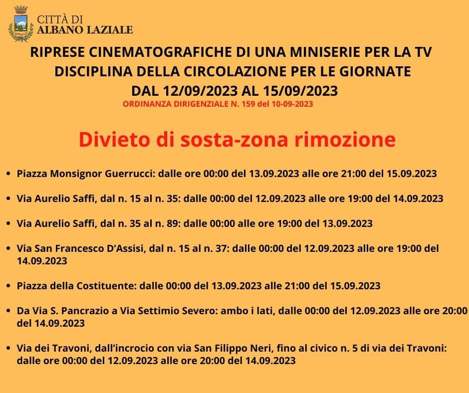 Istituiti divieti di sosta e zone rimozione ad Albano, sino a questo venerdì 15 Settembre, per riprese cinematografiche. Già dallo scorso martedì la cittadina castellana si è trasformata nel set di una miniserie per la tv. Le zone interessate sono Piazza Monsignor Guerrucci, via Aurelio Saffi, via San Francesco D’Assisi, ed ancora Piazza della Costituente, via San Pancrazio e via Settimio Severo ed anche dei Travoni.