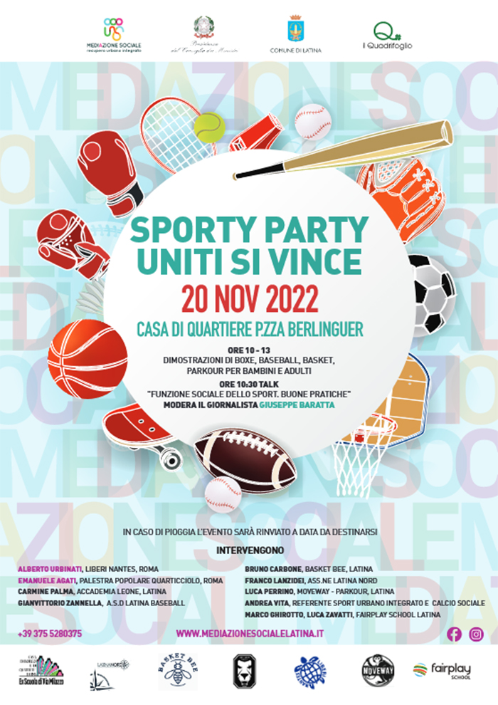 Domenica 20 novembre a Latina l’evento “Sporty Party”, inserito all’interno del progetto “Mediazione Sociale– Recupero Urbano Integrato”. L’appuntamento è dalle 10.00 alle 13.00 presso la Casa di quartiere di piazza Berlinguer. Parteciperanno alcune delle principali realtà sportive della provincia di Latina e di significative realtà romane quali i “Liberi Nantes” e la “Palestra Popolare Quarticciolo” che da anni utilizzano lo sport come strumento di inclusione sociale e di presidio del territorio.