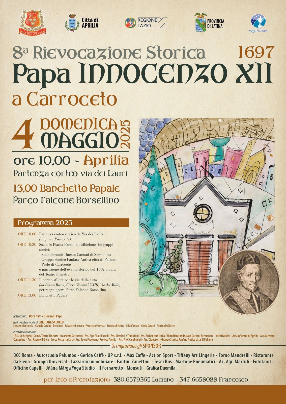 Domenica 4 Maggio ad Aprilia l’ottava edizione della Rievocazione Storica di Papa Innocenzo XII, un evento suggestivo che trasporterà Aprilia indietro nel tempo fino al 1697. La manifestazione si terrà a Carroceto e promette di coinvolgere la comunità ed i visitatori in un’atmosfera unica.