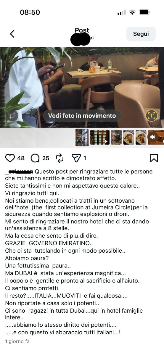 Dubai, c’è anche una famiglia di Aprilia negli Emirati in questi giorni di forte tensione. Susan, il marito Alessandro e le figlie, sono chiusi in hotel e seguiti dal Governo degli Emirati. Si trovano a Dubai per una vacanza che però si è presto trasformata in un’esperienza piena di paura. Un post sui social è servito per comunicare ai familiari che stanno tutti bene. Nella struttura ricettiva dove sono alloggiati sono state rafforzate le misure di sicurezza: “In alcuni momenti - spiega Susan - ci spostano in locali interno dell’hotel, soprattutto quando si sentono esplosioni o droni”. La voglia di tornare a casa è tanta: “L’appello è rivolto al Governo Italiano - spiega - vogliamo rientrare, non portate a casa solo i potenti”. Purtroppo per rientrare non ci sono ancora certezze. Inizialmente la compagnia con cui erano arrivati a Dubai ha programmato un volo per il rientro sabato 7 marzo, poco fa di nuovo annullato. Lo sconforto in questi momenti può prendere il sopravvento: "Il Governo di Dubai ci tutela, - dice Susan - la situazione è apparentemente sotto controllo, abbiamo paura. Vogliamo tornare a casa. Grazie perché date voce alle nostre emozioni".
