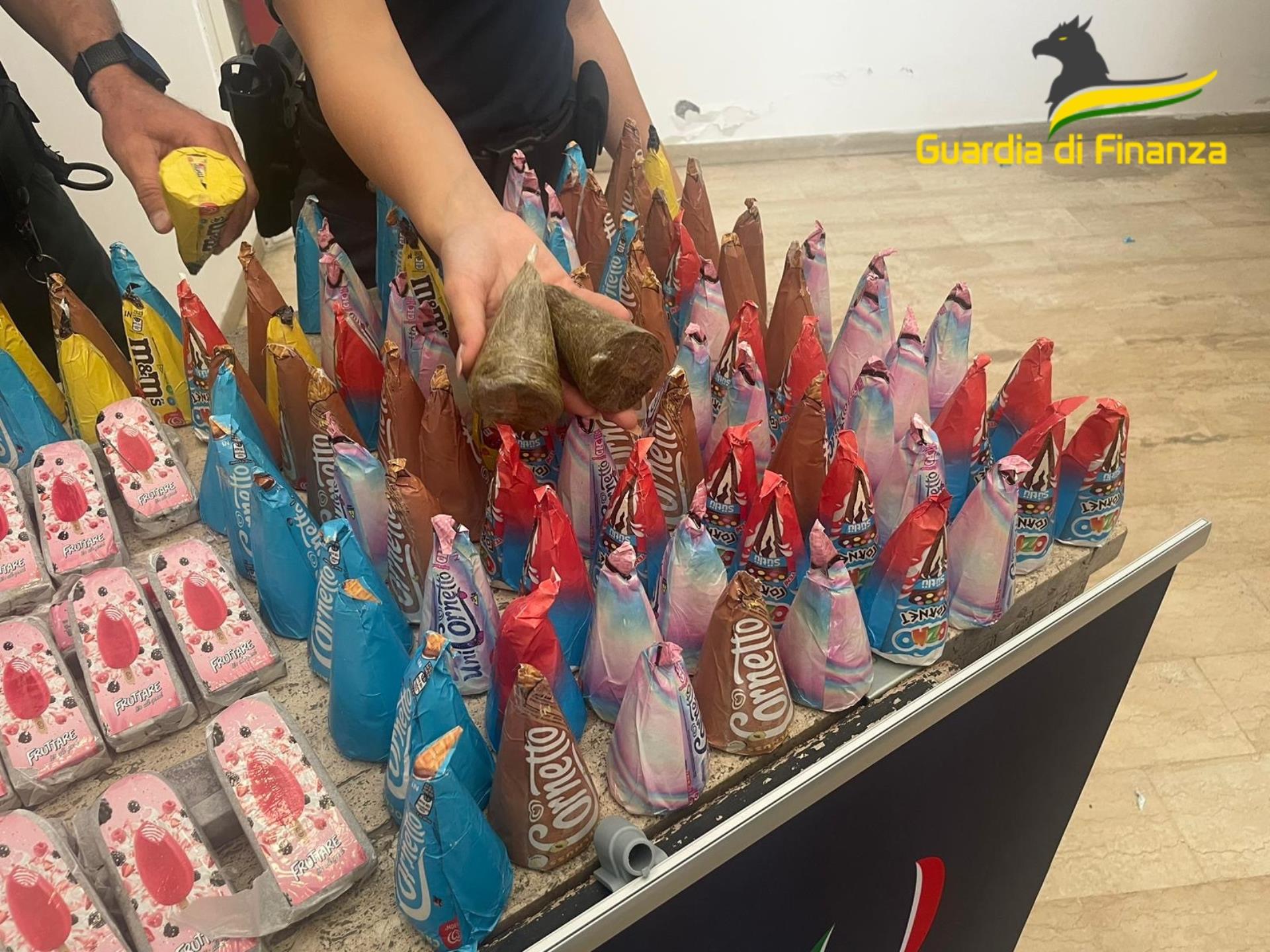 “Durante il pattugliamento del territorio, le “fiamme gialle” del 2° Nucleo Operativo Metropolitano di Roma hanno fermato per un controllo un’autovettura in sosta nell’area di servizio “SALARIA EST”, sulla Diramazione Roma Nord, rinvenendo, occultati in un doppiofondo ricavato nel telaio, 25 chilogrammi di hashish, contenuti in originali confezioni a forma di cornetto di gelato e di ghiacciolo.