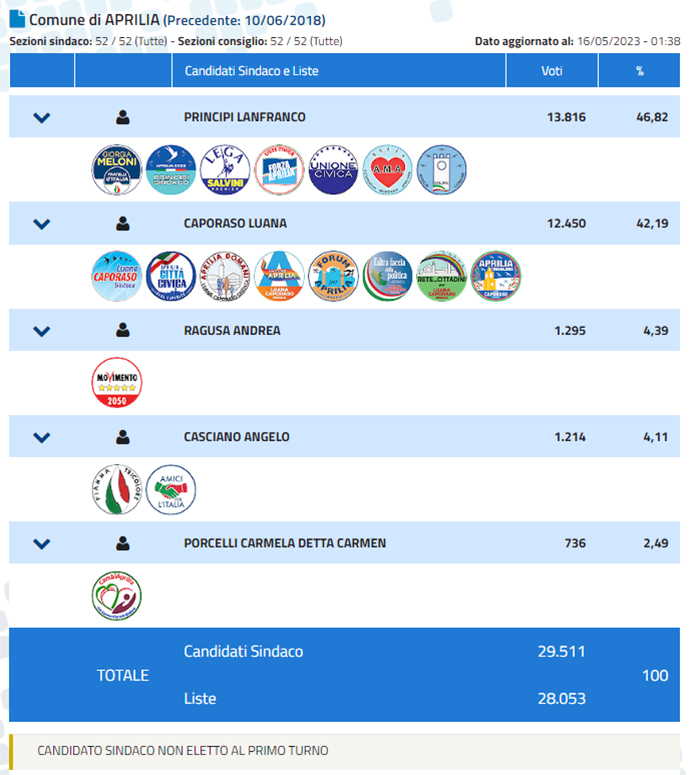 E' ballottaggio ad Aprilia tra Luana Caporaso e Lanfranco Principi, 4 i punti percentuali di scarto. I dati definitivi delle 52 sezioni scrutinate, vedono il candidato del centrodestra Principi in leggero vantaggio, con il 46,8% di consensi (13.816 voti). La candidata della coalizione civica, Caporaso, è al 42,1% (con 12.450 voti). Segue Andrea Ragusa dei 5 Stelle con il 4,3%, Angelo Casciano con il 4,1% e Carmen Porcelli con il 2,4%.