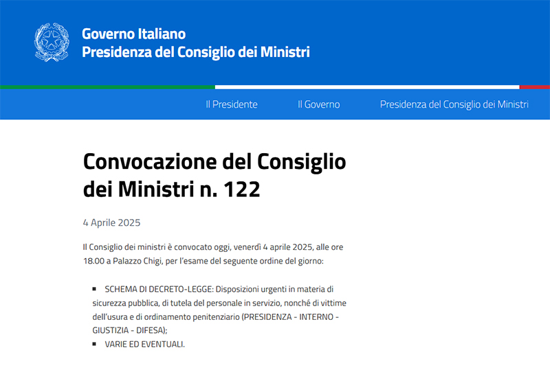 Questa mattina è stato reso noto l’ordine del giorno della convocazione di oggi del Consiglio dei Ministri: si parlerà di disposizioni urgenti in merito al decreto legge Sicurezza ed il resto della seduta sarà dedicata a “varie ed eventuali”.