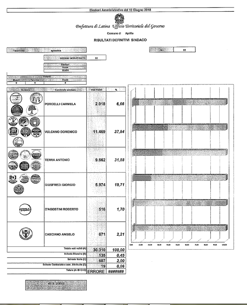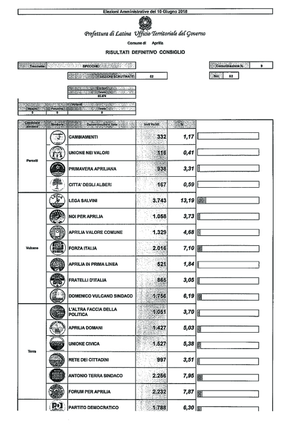 ELEZIONI AD APRILIA - DATI DEFINITIVI DEI CANDIDATI SINDACO E DELLE LISTE