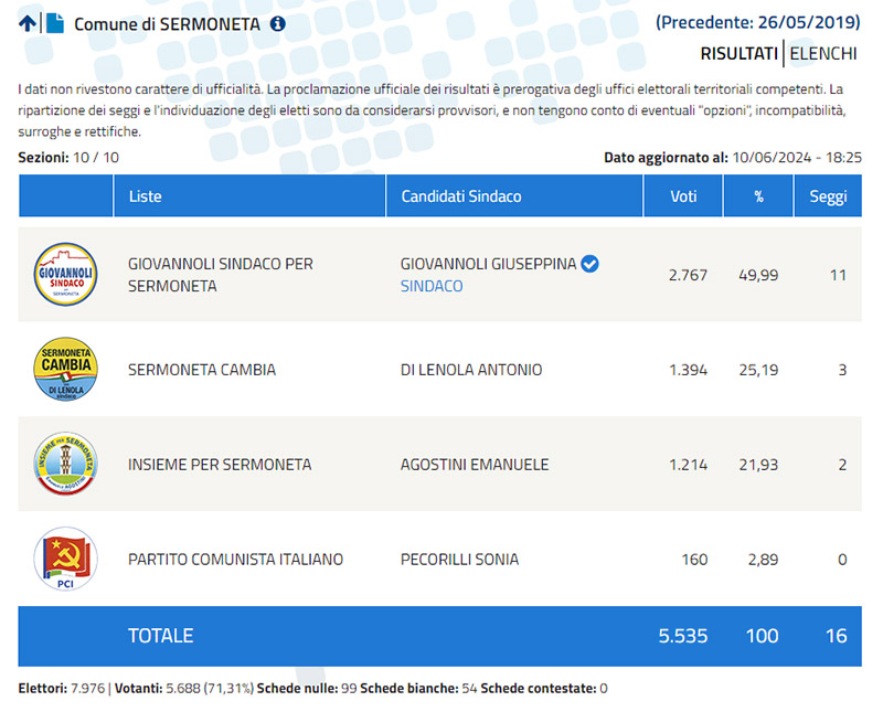 Elezioni Comunali in provincia di Latina: a Sermoneta Giuseppina Giovannoli si riconferma sindaco per la quarta volta, sfiorando il 50% di preferenze e lasciando indietro gli altri tre candidati.