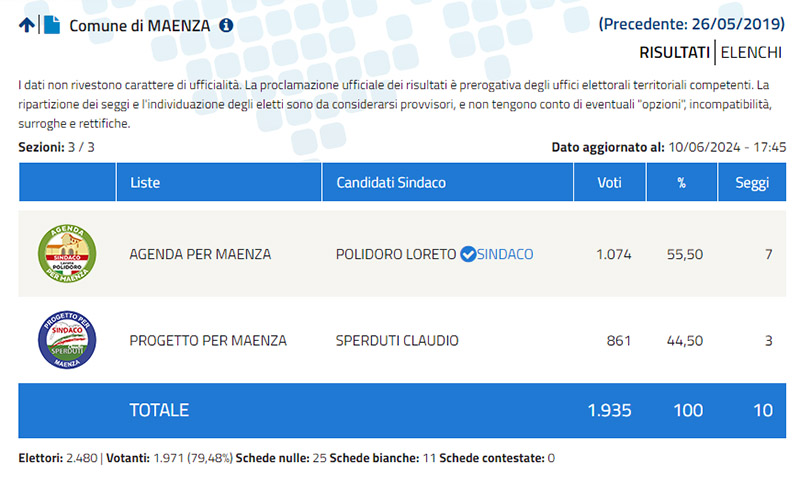 Maenza elegge sindaco Loreto Polidoro che con il 55,5% di voti supera il diretto avversario Claudio Sperduti.