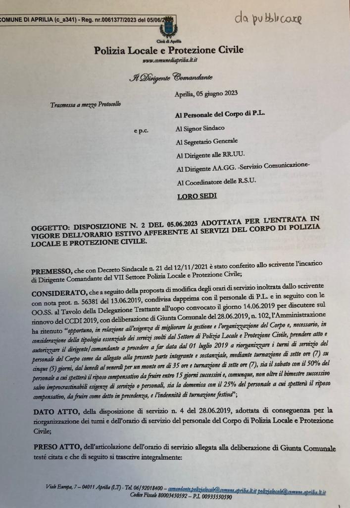 Entra in vigore l'orario estivo del corpo di Polizia Municipale di Aprilia. -