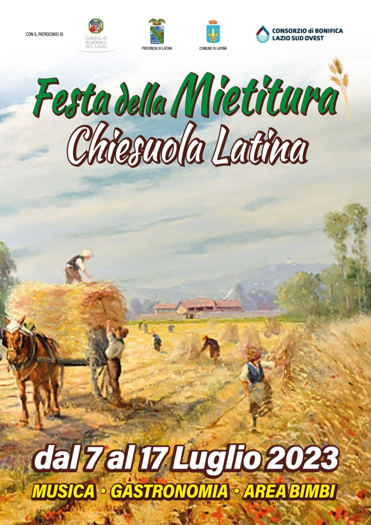 La Festa della Mietitura è promossa dall’Associazione Culturale Chiesuola con il patrocinio del Consiglio Regionale del Lazio, della Provincia di Latina, del Comune di Latina e del Consorzio di Bonifica Lazio Sud Ovest.