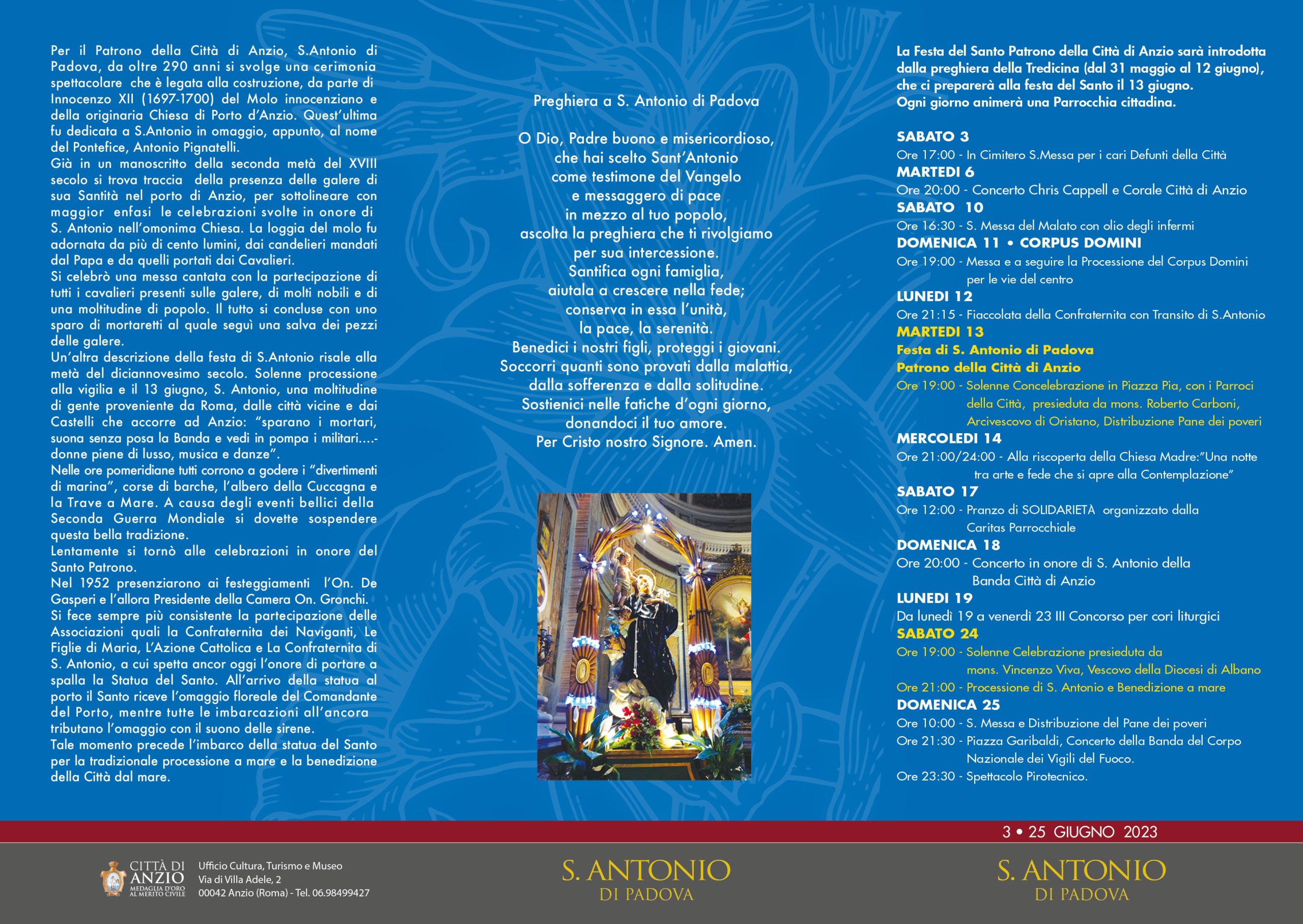 Sabato 24 giugno, alle ore 19.00, nella Chiesa Madre di Anzio, la solenne celebrazione presieduta dal Vescovo della Diocesi di Albano, mons. Vincenzo Viva; a seguire la tradizionale ed emozionante Processione per terra e per mare, con la statua di S. Antonio di Padova.
