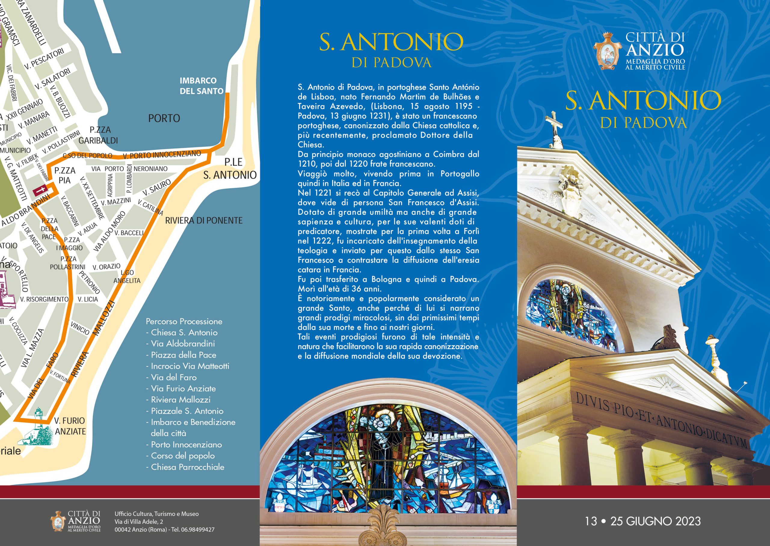 Il programma religioso, predisposto dal Parroco, Padre Paolo Cirina e dalla Chiesa Madre, per martedì 13 giugno, giorno di festa cittadina in onore del Santo Patrono, alle ore 19.00, prevede la Solenne Concelebrazione Eucaristica sul Sagrato della Chiesa in Piazza Pia, presieduta dall'Arcivescovo di Oristano, mons. Roberto Carboni, con la partecipazione dei Parroci della Città di Anzio e con la distribuzione del pane dei poveri.